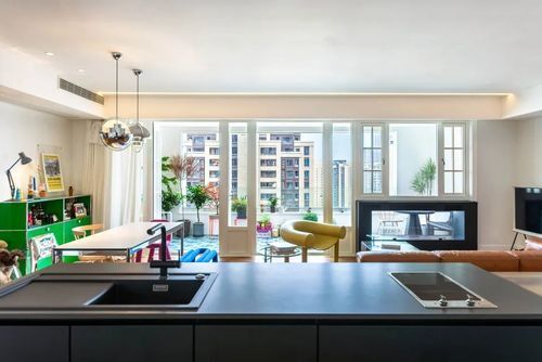 大扇玻璃窗面对西厨岛台,同侧半透明设计的壁炉与室外相连。每天清晨,阳光透过阳台洒进房间,将室内外融为一体,打破固有空间的死板,让自然流入生活。