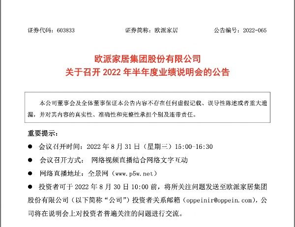 新浪定制家居讯 8月23日,欧派家居发出公告,将于2022年8月31日15:00-16:30结合网络视频直播和网络文字互动方式,召开2022年半年度业绩说明会。此次说明会主要针对2022年半年度营业成果、财务指标的具体情况与投资者进行沟通,并对投资者普遍关注问题进行回答。