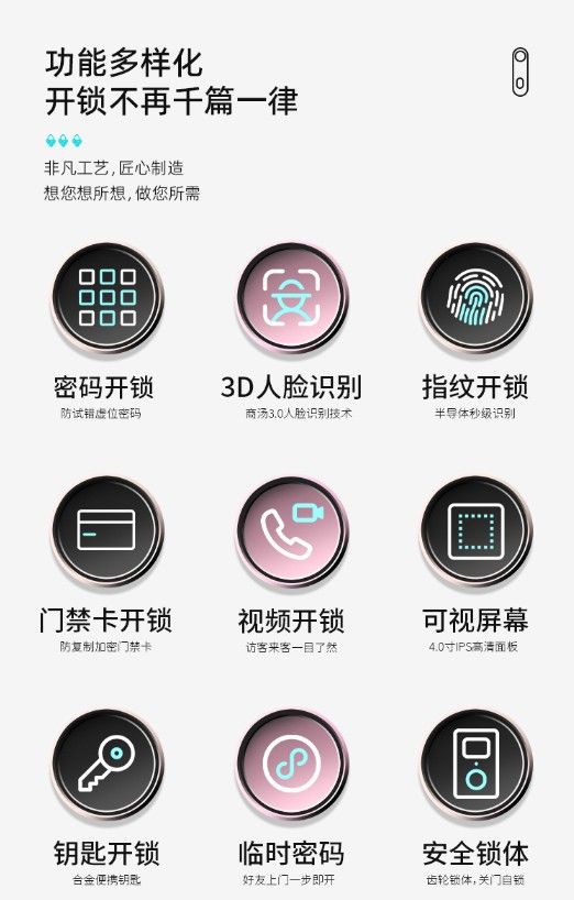 此外,在功能方面,汇泰龙“彤心锁”还集合了3D人脸识别、可视对讲解锁、密码开锁、指纹开锁、视频开锁、临时密码等8种方式,为人们带来了更好的家居安全守护和智能家居体验。人脸识别功能采用的是3D双目仿生人脸识别技术,搭配BCTC金融级人脸算法,不管是无光、暗光或背光等任何环境,都可秒速识别,带妆和佩戴饰品等情况也无任何影响。