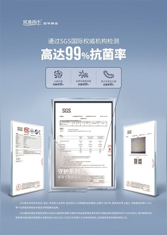 此次大会上重磅发布的守护系列新品延续银离子抗菌科技,通过聚合物技术将银离子均匀分布在织物表面,通过释放银离子起到抑菌防霉作用。经SGS、浙江方圆检测中心等权威检测认证,如鱼得水守护系列银离子抗菌窗帘可以有效抑制金黄色葡萄球菌、大肠杆菌、肺炎克雷伯氏菌等致病菌,抗菌率高达99%。