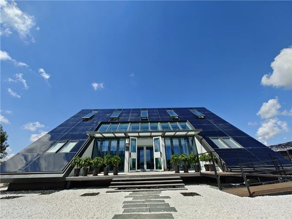 美的空调联合重庆大学等单位在河北张家口建造了一座美的“Green Home”,又称斜屋。斜屋建筑面积142平方米,拥有光伏板面积为98平方米,采用建筑光伏一体化(BIPV)的技术,屋面设计为45°倾角,以此最大限度提高太阳能的利用效率,晶莹的黑蓝色表面更倒映出张北地区天高云淡辽阔景观,艺术与低碳和谐统一。