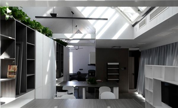 这栋面向未来的建筑,斜屋采用了美的全屋智能家电,营造智能化居家办公的低碳舒适环境。为配合此次比赛,美的空调研发了全直流供电暖通系统,一方面,采用直流额定电压375V供电运行供电,且融合控制空调、加湿机和新风机直接并入家庭能源管理系统,与房屋能耗设计相匹配,与普通空调相比,连接新能源和光伏储能系统更便捷,能最大限度地降低使用中的能量损耗;另一方面,该系统的智能自动模式,可根据室内外环境条件智能调节室内温湿度、CO₂、PM2.5等,主动智能地为用户创造舒适室内环境,将节能降耗绿色环保渗透至生活中的每个细节。