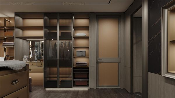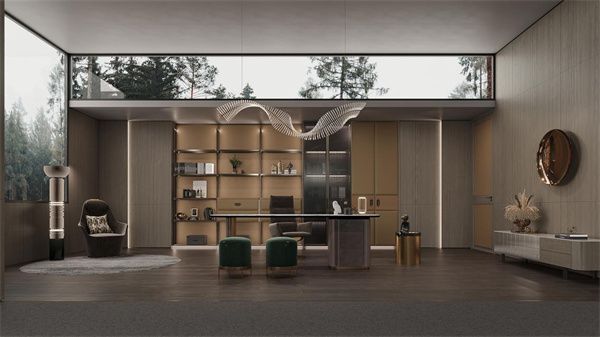 在材质上,空间整体使用皮纹搭配木纹,点缀金属肌理,让整体空间奢华、高级,艺术玻璃与黑岩石背板丰富空间的视觉层次,也可作为功能分区的视觉引导作用。