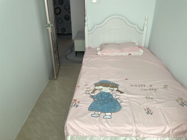 由于空间有限,最开始希望给珍姐安装推拉式的门,这样就可以在房间里布置一张1米2的床,由于珍姐对门的要求比较执着。“其他都无所谓,除了改造出两间房外,我就想要一个粉色的门。”改造项目组决定保留最小规格的平开门,一间房选择1米2的床,一间房选择1米的床,项目组专门为梓涵选择了粉色公主风的床上四件套。