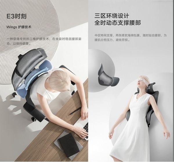 E系列一直是黑白调的高端旗舰人体工学椅,该系列产品存在的意义就是为了给用户带来极致的人体工学舒适感。三区护腰的流线型设计负责把背部压力均匀分散开来并根据坐姿进行自适应动态微调,高弹特网材料制作的透气网背蒙布,能有效帮助由于集中注意力而散发热量的人体保持通风散热。
