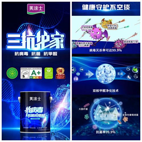 美涂士抗病毒抗菌抗甲醛健康墙面漆采用特殊抗菌技术,具备强效抗菌性能,多种常见细菌的抗菌率达99.9%。而且能有效灭杀生活中常见的人冠状病毒(HCoV- 229E)、甲型H3N2流感病毒、肠道病毒71型、脊髓灰质炎病毒(小儿麻痹)等病毒,病毒灭杀率可达99.9%,从而让舒适的家居环境更有免疫力!当然,产品在抗甲醛这一方面也是十分出色,采用双核甲醛净化技术,可高效吸附分解室内空气中游离甲醛等有害物,起到很好的空气净化作用,助你打造健康家居好环境。