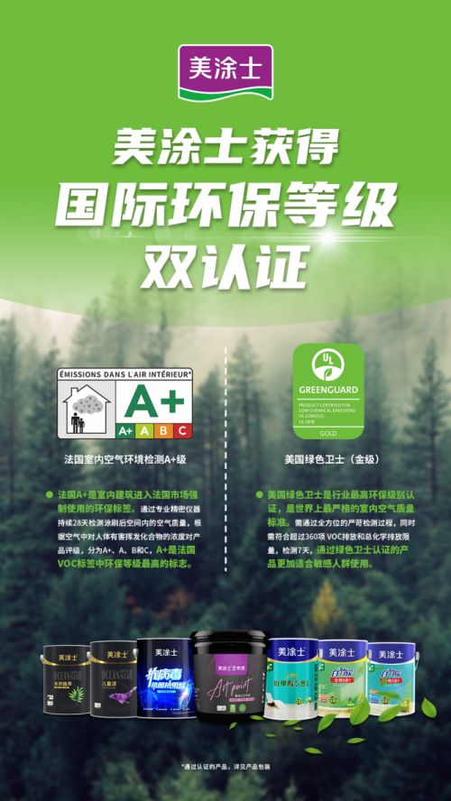 在这个后疫情时代,消费者除了对涂料基本的装饰需求之外,对涂料的环保和健康需求同样很重视,环保健康的涂料将会是未来的发展趋势。而美涂士一直秉承健康环保理念,从选料开始严格把控筛选,在生产工艺上使用创新的环保净味配方,确保产品优良的环保特性。更重要的是,美涂士涂料产品通过层层严格的审核,获得了十环认证、法国A+认证和美国绿色卫士金级认证等环保标志,成为营造健康环保的生活空间的安全保障。