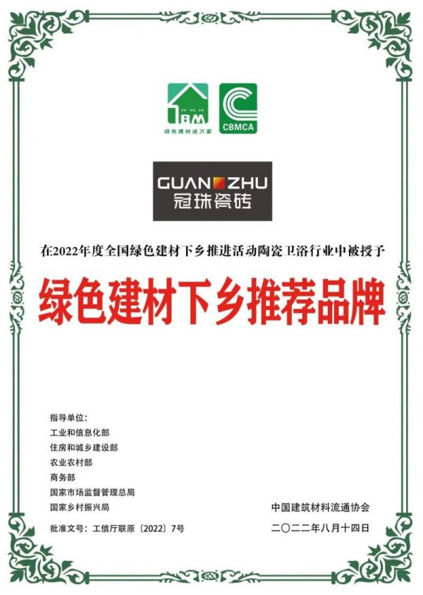 冠珠瓷砖与国家“绿色低碳”以及“乡村振兴”的发展大局同频共振,作为绿色低碳的代表品牌,被授予“中国绿色产品认证”证书、入选CCTV央视网甄选中国优势品牌并联合CCTV央视网助推绿色家居产业链高质量发展、入选“绿色建材下乡陶瓷卫浴推荐品牌及服务商”指导目录后,这一次更是实力上榜“绿色建材下乡推荐品牌”!