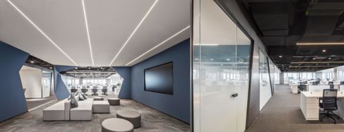 我们尝试打破艺术和设计的边界,从科技题材的电影中借鉴“空间蒙太奇”的手法。蒙太奇原是法语建筑学的术语,意为构成、组合、装配。在本质上,空间设计与电影是存在共性的,都是关于空间在时间轴上的构想和呈现。结合公司属性提取互联网的元素。通过数据球的切割形式演变成强烈的几何构成感。结合各职能部门细分出办公模块、研发模块、娱乐模块以及交融模块从而塑造不同的空间使用功能场景。而在装饰手法上,不同的空间都贯穿着同一个“科技”主题在点题呼应。