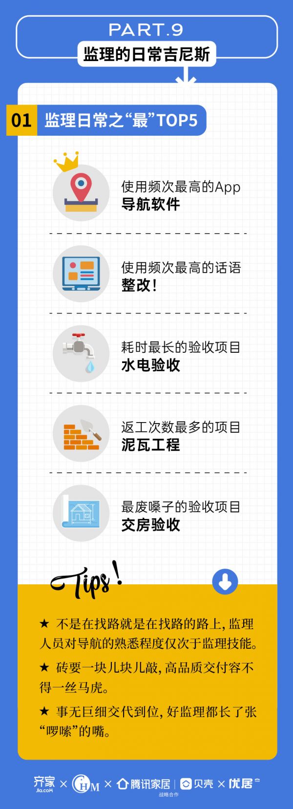 监理默默无闻的付出是为了守护业主的装修品质,据“监理报告”显示,家装监理使用频次最高的词语就是“整改”,而在监理的验收项目中返工次数最多的项目却是泥瓦工程;砖要一块儿块儿敲,高品质交付容不得一丝马虎,在所有的验收环节中,最废嗓子的验收项目是交房验收。穿梭于楼宇之间,家装监理不是在找路就是在找路的路上,监理人员对导航的熟悉程度仅次于监理技能,也就是说监理使用频次最高的App其实是导航软件。