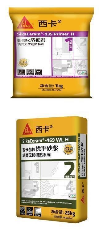 西卡赫拉墙面无忧铺贴系统,是指先对墙面进行界面处理后,再用墙面找平砂浆找平墙面至项目要求的平整度,待找平砂浆养护完并且通过验收后,用瓷砖背胶对瓷砖背面进行界面处理,再搭配瓷砖胶贴砖的室内墙面瓷砖铺贴系统,该系统涵盖4款西卡好物。