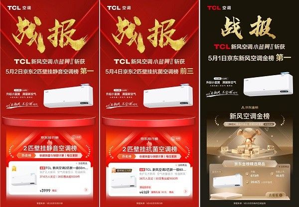 据电商平台数据显示,2021年12月8日京东平台开售当天,首发零售量突破1000套,单品浏览人次突破200万,斩获京东新风空调品类销售额、销售量、流量三冠王。今年4月22日TCL新风空调小蓝翼II 2匹挂机,在京东首发创下10分钟破1000套的销售佳绩,五一期间更是再次连续霸榜京东各类空调榜。