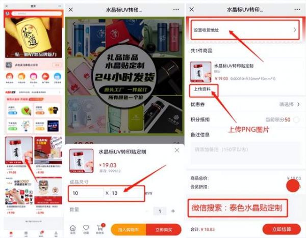 而下单定制的步骤更是做到了极简,只需选取定制商品链接,加入购物车或者立即购买,再填写实际打印尺寸以及数量,最后上传提前设计好的水晶标PNG图片文件付款提交即可。完全免除各种冗杂的沟通确认,前提是要有简单的作图能力,对作图有不明白的地方可以点击网站内的作图指引,图文视频均有,一看就会!