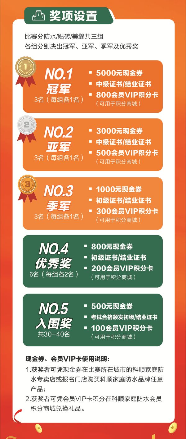 比赛分为防水、贴砖、美缝三个组别,各组分别决出冠军、亚军、季军和优秀奖,连入围也有奖金!
