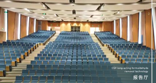 在学校除甲醛的项目治理中最复杂、最难处理的莫过于报告厅了。对于一般报告厅来说顶面会粉刷防火涂料,墙面一般会采用吸音板或吸音棉处理,地面会铺设地板或地毯,报告厅的桌椅一般会采用礼堂椅。同时为了保障隔音效果报告厅一般只有两个门、不会开设任何窗户,值得注意的是报告厅的层高一般在6-8米左右,最高甚至可达12米。