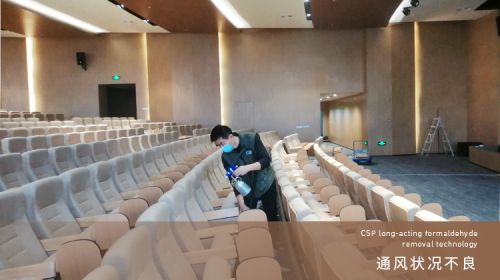 ③解决报告厅的通风问题时,我们需要根据报告厅的平面布局合理布置通风设备,增加通排风设备的使用以及净化器的摆放或新风系统的安装。建议在报告厅治理完成后使用7-14天的通排风设备,可以加大室内的换风对流吹洗次数,吹洗掉室内残留的有害气体,能有效缩短治理后的通风时间,大大节约时间成本。而净化器和新风系统我们建议作为常态化的换风过滤设备进行使用,尤其是在报告厅使用了吸音棉的情况下,可以有效吸附和过滤棉微粒,避免呼吸系统受到损伤。