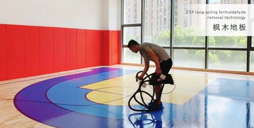 枫木地板:室内篮球场所用的枫木地板大多数为实木地板或实木复合地板,因此在治理时我们需要先进行地面清洁处理保障地板干净无尘。其实如果是实木地板我们只需采用芬多精进行除味喷涂即可,喷涂用量为10-15ml/㎡。如果是实木复合地板则需要先喷涂芬多精,喷涂用量为20-30ml/㎡;间隔五分钟待产品完全渗透后,再使用无光触媒进行甲醛加强处理,喷涂用量则为15-25ml/㎡。