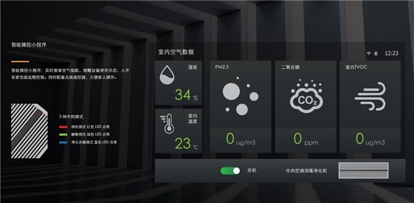 通过智能操控小程序,中央空调消毒净化机实现可视可控、远程操作。用户可实时查看空气指数,提醒设备使用状态,支持远程操控模式同时配备无线遥控器,方便家人操作。