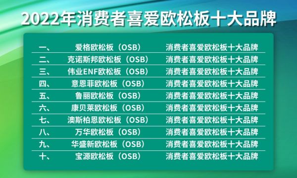 以上是2022年消费者喜爱欧松板十大品牌榜单,此次评选活动不仅是品牌的盛宴,更是引领行业发展方向,并推动更多欧松板品牌快速发展,为众多优秀企业提供充分展示自身实力的平台。