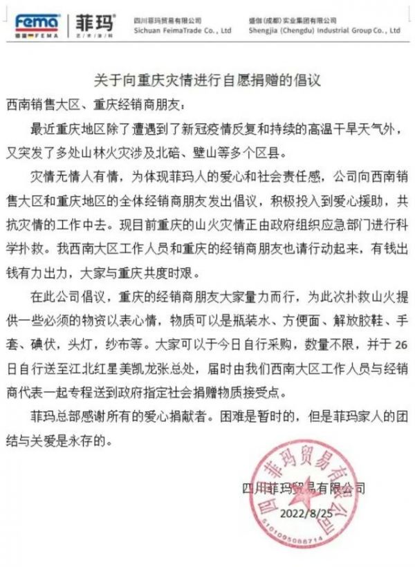 面对山火灾情,菲玛总部于8月25日紧急采购灾区紧缺物资,同时面向重庆经销商团队发出了自愿捐赠的倡议,全力向灾区提供支援。