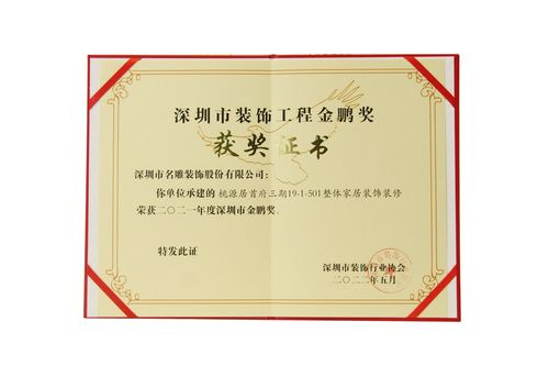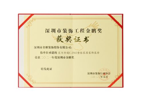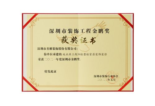 “深圳市装饰工程金鹏奖”,由深圳市装饰行业协会举办,旨在树立深圳装饰行业内的优秀企业和典范工程,促进深圳市建筑装饰工程质量及管理水平的提高,鼓励企业增强质量管理意识,提高工程质量,并为业内人士提供互相交流的平台,促进行业的健康稳步发展,发展至今,已成为代表深圳市装饰工程质量的最高荣誉奖。