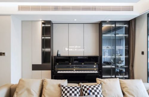 客厅沙发背后定制收纳柜和玻璃柜,空间得到有效利用,开放格、玻璃门等组合,为空间覆上灵动气质,钢琴放置在两柜中间,也给孩子打造了一方音乐圣地。