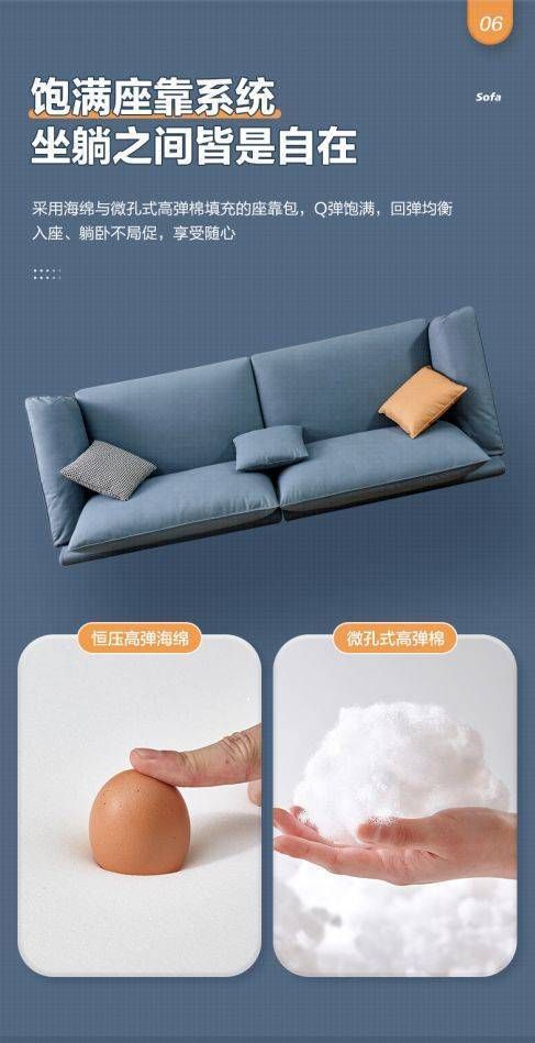 微孔式高弹海绵厚实饱满填充,分区多段式承托,为身体提供柔软又饱满的支撑力,即使全身躺下去也能稳定承托,久坐也不易扁塌,感受深陷其中的包裹感。