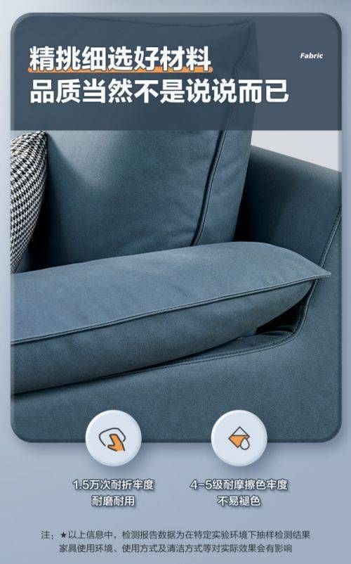 沙发面料选用高分子纤维面料--肤感科技布,手感亲肤柔软,透湿透热。这种布料每平方米拥有上万个微型逶气孔,被誉为“会呼吸的面料”,触感亲肤,夏季高温人坐上去也不会觉得闷热不透气,透气性佳,皮肤可以“大口呼吸”。