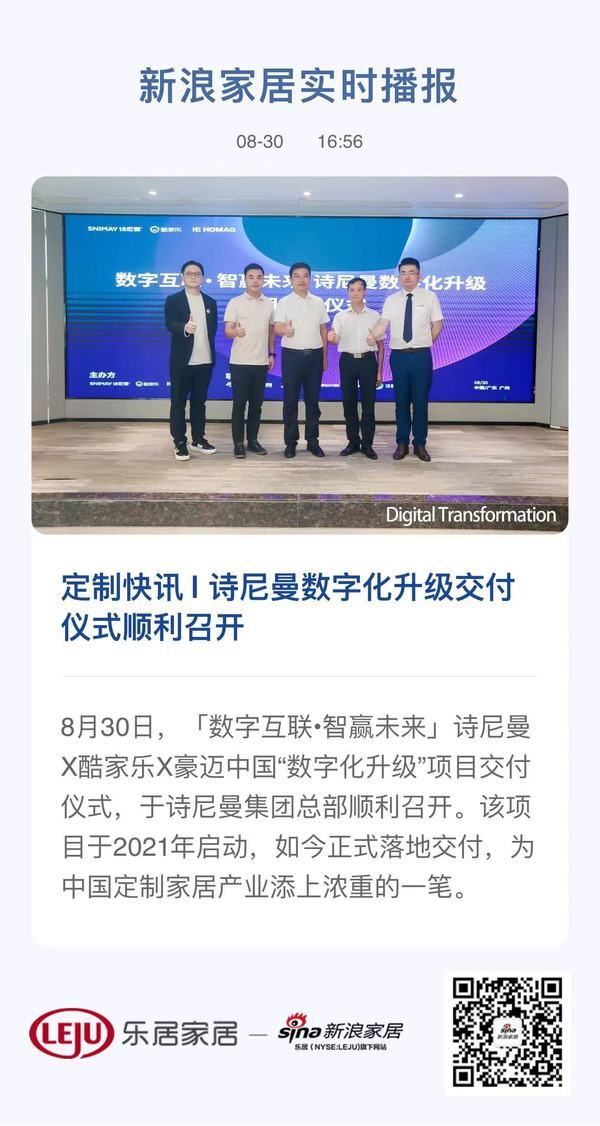 新浪定制家居讯 8月30日,「数字互联•智赢未来」诗尼曼X酷家乐X豪迈中国“数字化升级”项目交付仪式,于诗尼曼集团总部顺利召开。该项目于2021年启动,如今正式落地交付,为中国定制家居产业添上浓重的一笔。