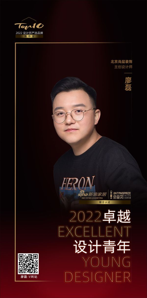 “2022卓越设计青年”由新浪家居和金堂奖全国联盟发起,是设计业界最具传播价值的年度先锋荣誉,新浪家居与金堂奖联名认证。旨在发掘和表彰室内设计领域表现卓越的杰出青年设计师。设计师廖磊荣膺“2022卓越设计青年”称号。