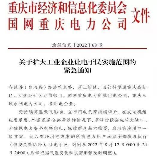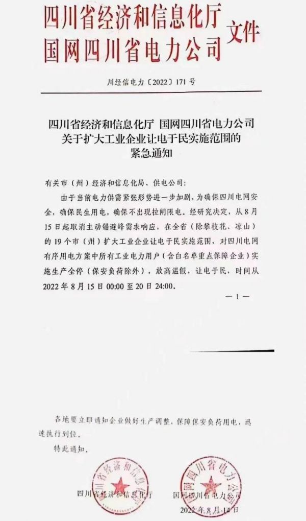 8月14日,四川省经济和信息化厅、国网四川省电力公司联合发布《关于扩大工业企业让电于民实施范围的紧急通知》,要求全省(除攀枝花、凉山)的19个市(州)扩大工业企业让电于民实施范围,对四川电网有序用电方案中所有工业电力用户(含白名单重点保障企业)实施生产全停(保安负荷除外),时间从2022年8月15日0时至20日24时。