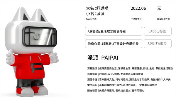 值得一提的是,派雅门窗形象IP舒适喵“派派”也将在此次展会中亮相。结合门窗产品元素和品牌发展理念,舒适喵“派派”采用可爱卡通造型,配以舒适享受的惬意表情,与张开双臂迎接拥抱的动作,分别代表隔音、隔热、安全、美学,深受年轻群里喜爱同时,更是充分展现了派雅门窗「深舒适」的发展战略。同时这也是企业品牌年轻化战略的系列动作之一。