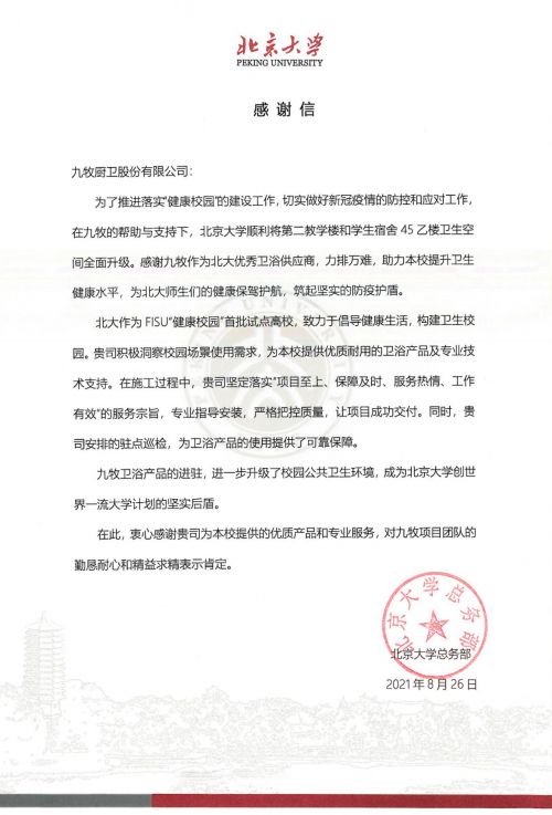 九牧为北京大学升级公共卫浴空间,为师生们营造了舒适洁净的校园环境。九牧产品的入驻,标志着北京大学的健康校园的建设更进一步,为北京大学建设成为世界一流大学贡献来自民族品牌的力量,助力这所拥有百年辉煌校史的高等学府,再上新台阶。为此,校方特意撰写感谢信,致谢九牧团队在项目中力排万难的努力成果,高度肯定了来自九牧的优质产品和专业服务。