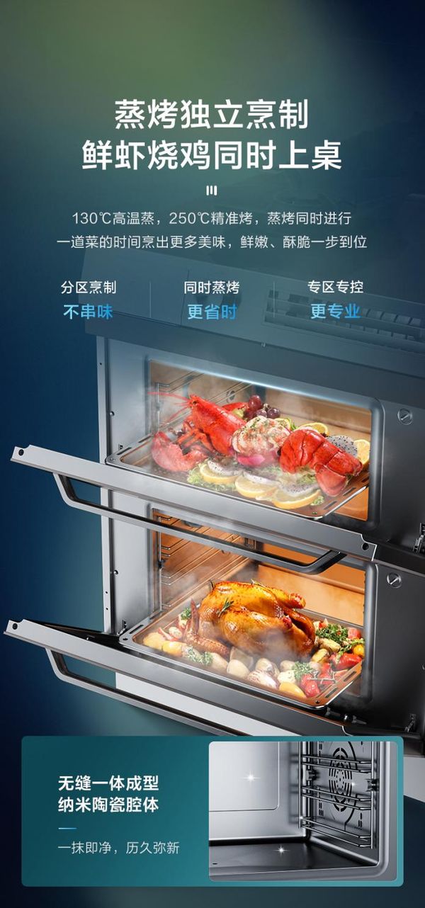 在蒸烤多功能烹饪方面,采用了20L蒸箱+25L烤箱的蒸烤独立腔体设计,设计规划更加合理,130℃高温蒸,250℃精准烤,蒸烤可同时进行,高效省力,一步到位。130℃高温蒸,由蒸汽发生器生成蒸汽后直接喷入腔体,能够保证蒸汽迅速穿透食材,留住营养与健康。嫩烤空气炸,不仅能烤还能炸,利用360°热风循环炸烤,实施准确把控温度,逼出油脂的同时锁住汁水和营养,成就轻脂酥脆的健康美味。