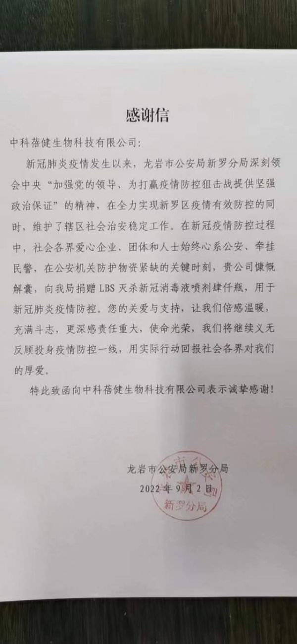 在防疫期间对公共场所进行喷洒消毒药水是目前切断传染源的有效方法,而LBS抗菌消毒喷剂作为目前高效杀毒的代表性产品,一直以来都是比较紧张的防疫物资,作为一家有社会责任感的现代公司,中科科技向社会各界免费捐赠了大量防疫用品,其中就包括LBS抗菌消毒喷剂,也收到了来自许多事业和机关单位发来的感谢信,足以证明该公司是一家具有社会责任心,能与民众共度时艰的良心企业。