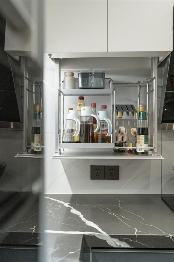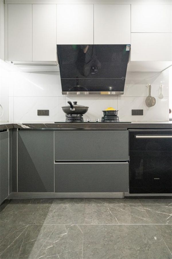 橱柜选择和墙地瓷砖同色调的深灰色,让厨房空间在视觉上更具一体性,雅白色的吊柜搭配隐藏式的收纳拉篮,烹饪时油盐酱醋随手拿放,让烹饪更高效。
