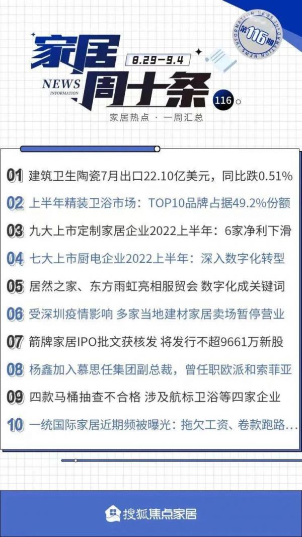 家居周十条丨建筑卫生陶瓷7月出口额微跌、箭牌IPO批文获核发、杨鑫加入慕思…