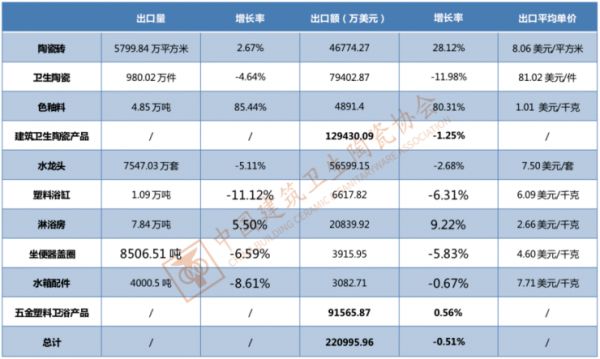 值得注意的是,陶瓷砖出口量近一年来同比首次出现增长。卫生陶瓷出口量同比微跌,由于出口单价继上个月以来再次出现下降,出口额同比出现两位数下降。色釉料出口量创造了自2014年以来的历史新高。五金塑料卫浴产品中,仅淋浴房出口量同比去年同期实现增长,水龙头、塑料浴缸、坐便器盖圈、水箱配件出口量均有所下滑。