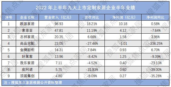截至2022年8月31日,九大上市定制家居企业的2022半年度业绩报告已经全部披露,除欧派家居、志邦家居和金牌厨柜外,其他企业的净利润均不同程度的下滑。