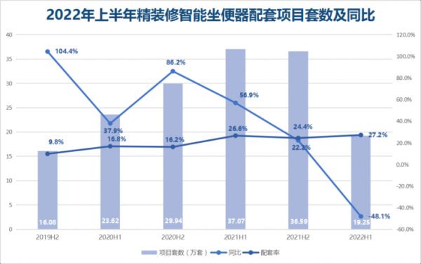 2022年上半年整体精装大盘较去年相比市场仍持续下滑,但环比增幅明显,据奥维云网(AVC)地产大数据显示,2022年1-6月,商品住宅精装开盘项目总计943个,同比-42.1%,精装规模70.52万套,同比-48.9%;精装卫浴项目个数943个,同比-42%;配套量约70.3万套,同比-49%。