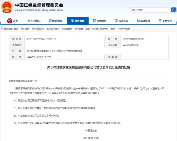 2022年9月1日,中国证监会发布关于核准箭牌家居集团股份有限公司(以下简称“箭牌家居”)首次公开发行股票的批复,核准箭牌家居公开发行不超过96,609,517股新股。本次IPO箭牌家居计划融资18.09亿元。
