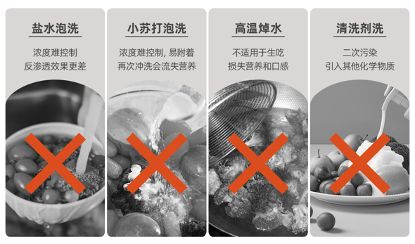 盐水泡洗虽然能够产生一定的杀菌效果,但是对于农残的溶解作用是有限的。要想保证清洁效果,盐的浓度是至关重要的,浓度太低清洁力有限,浓度太高会产生反渗透作用,使得盐和农残反渗入食材,效果比清水洗还要差,不仅影响口感,还会增加我们对盐分的摄入。