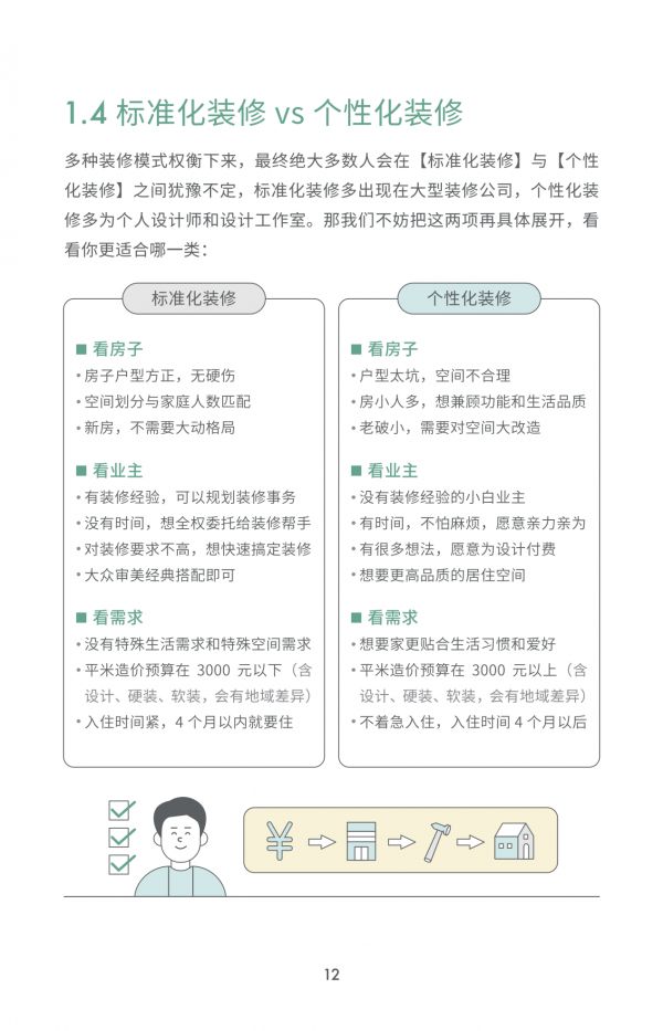 它也是一本轻松易读的小册子,如果你是第一次接触装修的新人,对装修事务毫无头绪,它能让你快速掌握装修前期必学的重点;如果你已经有计划找一位“装修合伙人”,却拿不定主意该找谁,它可以帮你解答一些疑惑;如果你对家居感兴趣,却还不着急装修,也不妨翻翻它了解一下自己的需求和对家的规划。