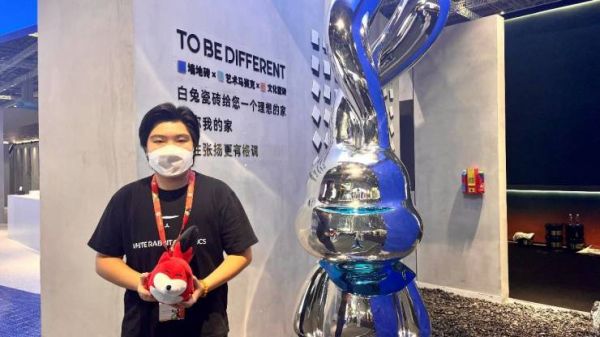 【黄芝霖】:首先展厅入口处可以看到我们的IP形象:能量兔,这是为了升级焕新整个白兔品牌而打造的,意在塑造一个潮酷有个性、爱家爱生活的形象;在产品上,我们做的很多产品比较平面化,现在则更多地研发一些像马赛克这样有立体感和凹凸感,让空间看起来更有活力的产品,近几年侘寂风、水泥风非常流行,在这方面我们也做了相关研究,并且在产品研发上对类似风格质感的呈现更重视,靠近现在年轻化的审美需求。
