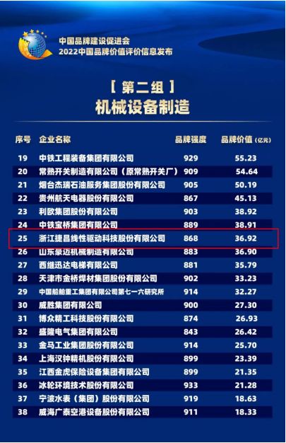 2022年9月5日,中国品牌建设促进会、中国资产评估协会、新华社民族品牌工程办公室等单位在京联合发布“2022中国品牌价值评价信息”,捷昌驱动以品牌强度868,品牌价值36.92亿元位列机械设备制造TOP榜。