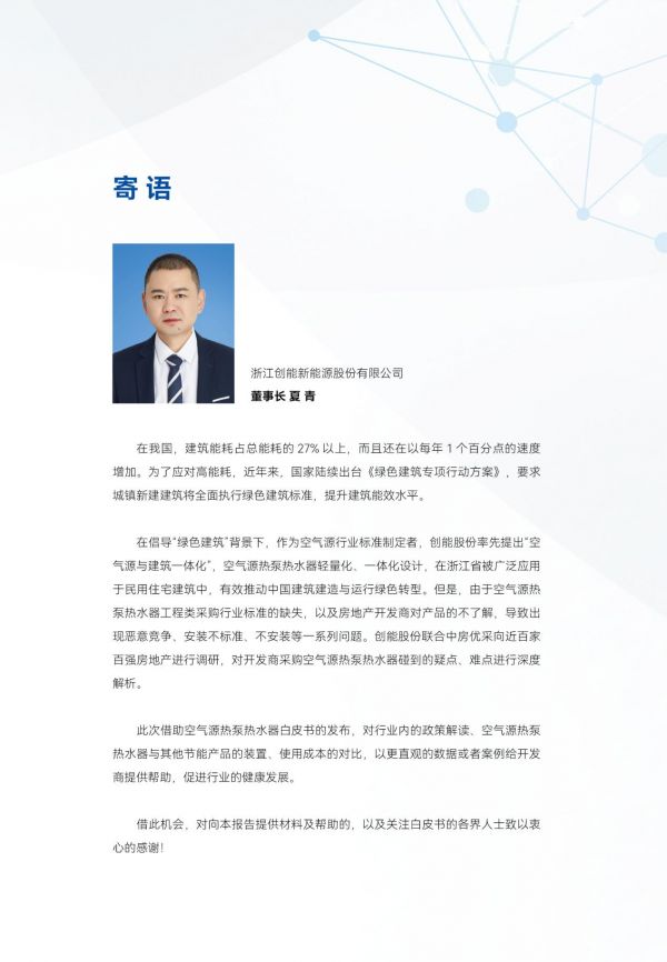 创能股份董事长夏青在《白皮书》寄语中表示,在倡导“绿色节能建筑”背景下,空气源热泵热水器被广泛应用于民用住宅建筑中。当前,针对空气源热泵热水器市场采购标准缺失,品牌之间恶性竞争,产品安装等问题,《白皮书》以直观的数据或者案例给开发商提供帮助。