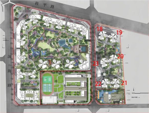 项目规模:总用地面积为21389.69㎡,总建筑面积130902.63万㎡,其中地上建筑面积103839.46㎡,地下建筑面积27063.17㎡。包含2栋29层(21、22栋)、4栋32层(18、19、20、23栋)的高层住宅及临街商铺,设地下室2层,用作车库和设备房;