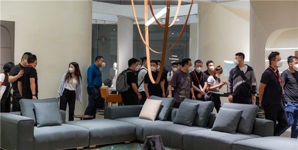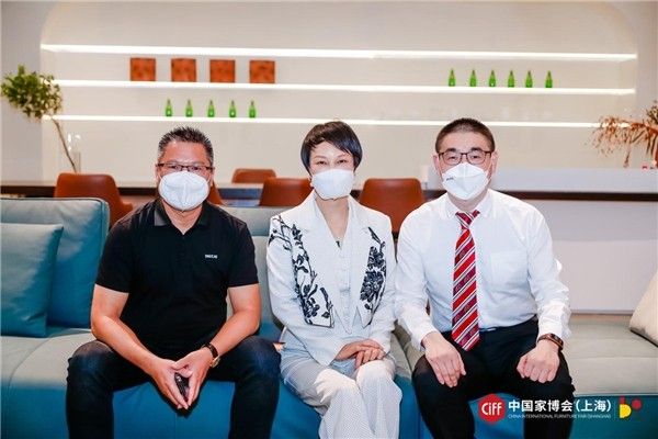 红星美凯龙车建芳女士,敏华控股集团首席副总裁王兵也莅临普丽尼展位,与普丽尼总经理陈春波进行了深度的洽谈与产品的细致探讨,还现场试座了普丽尼2022最新款沙发。