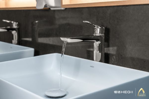 而为了对抗高频污渍场景,保障公共区域台盆与龙头的亮久如新,改造项目还选择了搭载恒洁水净技术的龙头与琉晶瓷系列台盆。恒洁水净技术可做到高效疏水,摆脱来自水垢与污渍残留的长期困扰;而历经1260℃高温烧制工艺的琉晶瓷系列台盆,寿命上不仅坚固耐用,并保留了纤薄优雅的时尚设计,构造棱角分明,轻巧灵动,外表滑细腻,更易清洁,与拓宽后的公共空间遥相呼应,流露出巧夺天工的自然艺术气息。