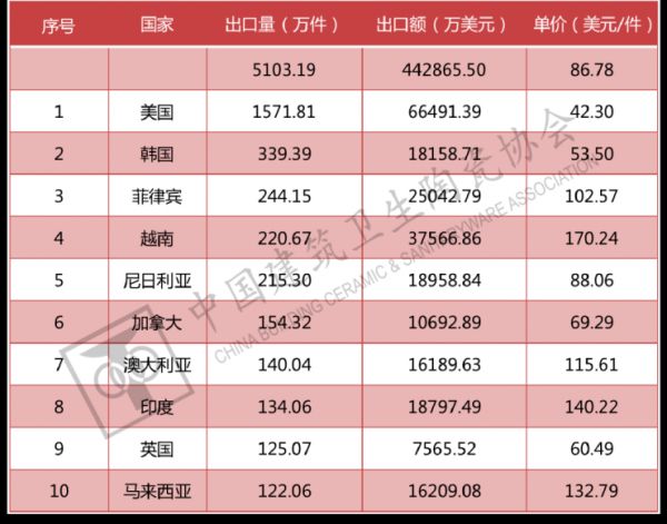 上半年,英国在我国卫生陶瓷出口目的国中排行第九